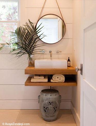 14. آینه گرد بالای روشویی. می توانید از آینه هایی به شکل های مختلف بالای روشویی استفاده کنید، ولی آینه گرد چیز دیگری است و حالت خطوط راست و زوایای تیز کابینت و روشویی را می شکند.