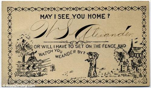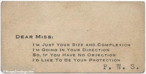 کارت هایی که فقط جای خالی یک اسم بر آن کم داشت و مردان در طی روزها و شب های هفته، هر جا که زنی را می دیدند که برای شان مطبوع و دوست داشتنی بود و یا کنجکاوش را بر انگیخته بود مورد استفاده قرار می گرفت. از قطعات ساده منظوم که پیامی ساده مبنی بر اینکه از شما خوشم امده است و اگر اجازه دهید تا در منزل تان بدرقه تان کنم و تا معرفی شغل و موقعیت و …