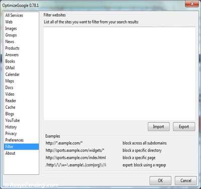 OptimizeGoogle نام یک افزونه‌ی کاربردی است که با استفاده از آن می‌توانید انتخاب کنید چه دامنه‌هایی در نتایج جستجوی موتور جستجوگر Google دیده نشوند.
