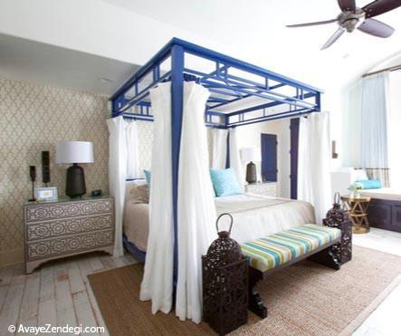 رنگ آبی لاجوردی دوباره در اتاق خواب و برای تخت و درهای اتاق استفاده شد.