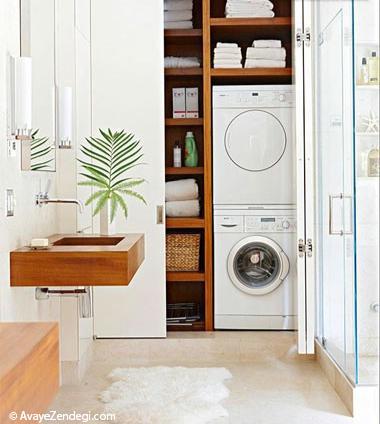 برای قرار دادن حوله ها و وسایل حمام، کمددیواری در نظر بگیرید. برای اینکه هویت طبیعی خود را حفظ کند، می توانید از چوب های ساج برای طبقه بندی داخل کمد استفاده کنید. در داخل این کمد می توانید ماشین لباسشویی را نیز قرار دهید. درب بیرونی کمد را نیز به رنگ دیوارها نقاشی کنید تا از بیرون مینیمال و آرامبخش دیده شود.