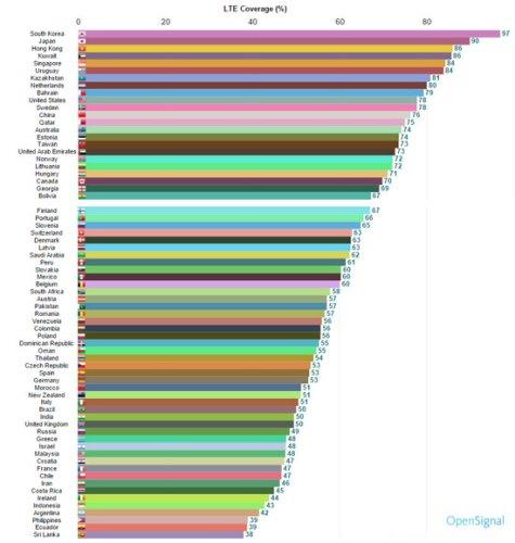 بار دیگر شبکههای تلفن همراه در کره در این قسمت نیز پیشتاز تکنولوژی LTE هستند. کاربران این شبکههای همراه در 97 درصد زمان میتوانند از شبکه LTE استفاده کنند تا شبکه نسل چهارم نیز در این کشور فراگیری همانند شبکههای نسل دوم و سوم داشته باشد.