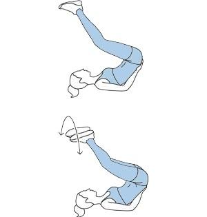 پشت به زمین دراز بکشید. پاها را از زانو خم کرده و به بالای سر بیاورید. برای حمایت از بدن می‌توانید دست‌ها را زیر کمر قرار دهید. در این وضعیت پاها را بصورت چرخشی در فضا بچرخانید. بعد از گذشت چند ثانیه تمرین استراحت کرده و حرکت را تکرار کنید.