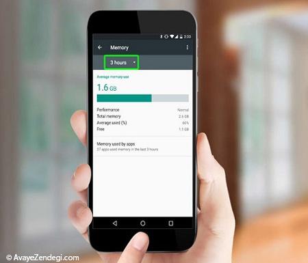در صفحه بعدی به صورت پیش فرض نمای کلی از حافظه مورد استفاده تلفن طی سه ساعت گذشته را مشاهده خواهید کرد. در این بخش رده بدنی عملکرد، کل حافظه مورد استفاده، میانگین استفاده به صورت درصد، و مقدار حافظه رم آزاد نیز نمایش داده می شوند.