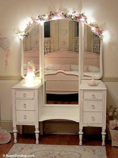 با رنگ سفید آینه میز آرایش، این نور جلوه اتاق را زیبا و براق تر می کند. تزیین آینه با نور پری و نخ ابریشم اطراف آینه مربع، اتاقی رویایی نمایان می سازد.