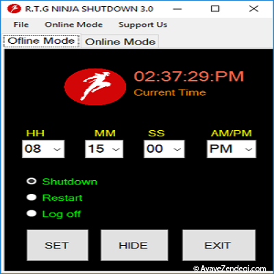 همه چیز داخل نرم افزار خیلی واضح می باشد. از بخش آفلاین آن ساعت، دقیقه، وثانیه را تنظیم کنید. به علاوه، شما می توانید از روی سه گزینه ی خاموش، روشن و ری استارت یکی را انتخاب و دکمه ی set را انتخاب کنید.