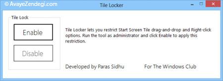 Tile Locker یک برنامه کم‌حجم و کوچک برای ویندوز ۸ می‌باشد که به شما کمک می‌کند تا امکان ویرایش کاشی‌ها را برای مدت مورد نظرتان قفل کنید و دیگر نظم آن‌ها به هم نخورد.  این برنامه به صورت یک فایل EXE و پرتابل طراحی شده است و نیازی به نصب آن بر روی ویندوز نیست. استفاده از آن نیز بسیار راحت و پیش پا افتاده است؛ کافیست برنامه را به صورت رایگان دریافت و سپس آن را با گزینه‌ Run as Administrator باز نمایید.(مطابق شکل)