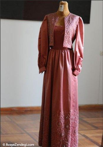 پیراهن تافته صورتی نیز در قسمت دیگری از این گنجینه وجود دارد که با نگین و منجوق تزئین شده است. پیراهن این اثر کاملا ساده طراحی شده است اما در قسمت کت آن منجوق و ملیله به شکلی زیبا کار شده است. طرحهای کار شده بر روی این لباس زمینه ای هندسی و اسلیمی را در خود دارد.