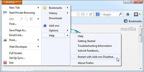برای این کار به منوی فایرفاکس رفته و از منوی Help گزینه ی …Restart with add-ons dsiabled را انتخاب کنید.