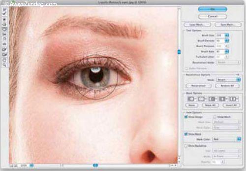 ۷- روش دیگری هم برای درشت تر کردن چشم ها وجود دارد و آن استفاده از ابزار Liquify است ، جهت اعمال کردن این روش بعد از گام ۱ به سراغ این مرحله بیایید ، خب با اطمینان از اینکه روی لایه Background هستید بروید به Filter>Liquify (کلید ترکیبی : Ctrl+Shift+X) ، با زدن کلید Z می توانید روی چشم ها زوم کنید.
