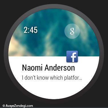همانند بخش Notifications در اندروید، پیامها در روی صفحهی Android Wear بسیار کوتاه هستند. همانند عنوان یک ایمیل، عنوان و ساعت قرار ملاقات، چند کلمهی اول یک پیامک و … البته هماکنون میتوان پیامهای Gmail را با زدن انگشت بر روی آنها باز کرد و چند خط از آنها را روی صفحهی ساعت دید. دستاندرکاران میگویند برنامهنویسان میتوانند Notification های طولانیتری بسازند به گونهای که کاربر با کشیدن انگشتش به سمت چپ یا راست بر روی صفحه ادامهی آن را بخواند.