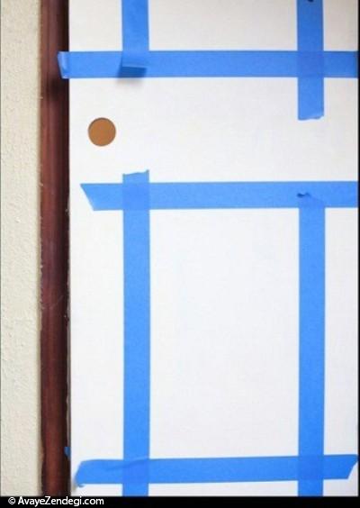 4. پس از خشک شدن رنگ، طرحی که قرار است وسط در ایجاد کنید را با چسب روی سطح در مشخص کنید. با متر یا خطکش، طرح را به طور دقیق اندازه بزنید و با مداد روی در مشخص کنید. سپس با چسب مخصوص نقاشی، آن را کادربندی کنید.