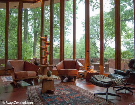 قاب های بلند چوبی همانطور که در تصویر در خانه ای با طراحی فرانک لوید رایت می بینید به اتاق خطوط عمودی می دهند و باعث می شوند که درختان بلند را از داخل خانه بتوانید مشاهده کنید. این مدل قاب ها برای فضای نشیمن مدرن مناسب است، به خصوص اگر سقف خانه بلند باشد.