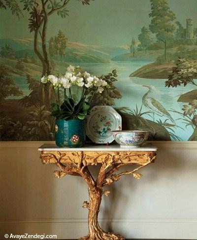 اتاق ناهارخوری سنتی اثر لورن کینگ: اتاق ناهارخوری منزل لورن کینگ، طراح فشن، در لوس آنجلس دیوارهایی با مناظر زیبای نقاشی شده با دست دارد. کنسول زیبای آب طلا اثر نایل اسمیت است که چینی های صادراتی زیبا روی آن قرار داده شده اند.