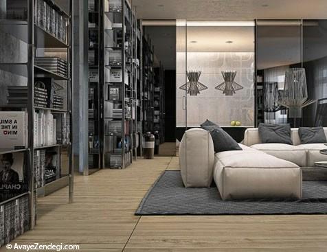 آپارتمان سوم نیز مبلمان چرمی و تیره دارد. پرده ها با دو رنگ سفید و سیاه انتخاب شده ند. کفپوش چوبی با رنگ روشن، با قالی های بولد و تیره فر شده اند. پالت اصلی رنگ این خانه را مشکی، توسی و بژ تشکیل داده است.چرم مشکی مبلمان به آن جلوه زیبایی بخشیده است و در عین حال راحتی زیادی را نیز به بیننده القا می کند. آباژورهایی که برای نورپردازی این خانه انتخاب شده اند، طراحی بسیار جالبی دارد. کتابخانه ای که برای آن در نظر گرفته شده است، طراحی کاملا ساده و مینیمال دارد. در مقابل آن یک صندلی با طراحی زیبا قرار داده شده است که به زیبایی فضا افزوده است.