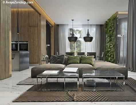آپارتمان آخری که انتخاب کرده ایم رنگ بیشتری در خود دارد. یعنی از پالت خنثی بیرون آمده است. گیاهانی که در گوشه ای از نشیمن کاشته شده اند، کوسن های سبز و دیوارهای چوبی به زیبایی بیشتر این واحد افزوده است. بعلاوه، در گوشه ای از خانه نیز، یک دست مبلمان سبز کار شده است. کف این خانه به جای پارکت های چوبی، سنگ های سفید با رگه های تیره است که موجب زیبایی بیشتر خانه شده است.همه وسایل دکوری با وسواس خاصی انتخاب شده اند تا سیاست مینیمال بودن حفظ شود. به طور مثال، باید به آویزهای بالای کانتر آشپزخانه اشاره کرد.رنگ سبزی که در نشیمن و غذاخوری وجود داشت، در اتاق خواب هم وجود دارد.